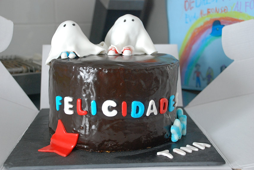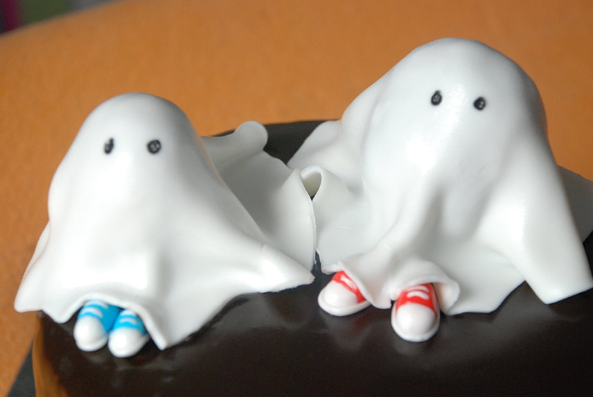 Espero que os guste: tarta de naranja rellena con ganaché de chocolate negro. ¡Hasta los fantasmitas eran totalmente comestibles! Propongo que intentéis averiguar de qué los hice (Cristina no se pudo resistir y me lo preguntó nada más verme! jajaja).