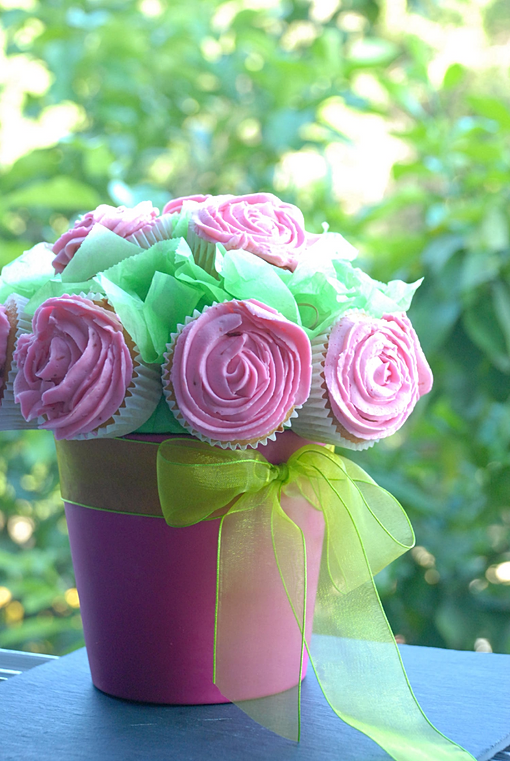 Y voilà! Maceta de cupcakes de pera con buttercream de fresa: ¡sencillamente espectacular! Debo reconocer que soy más de dulces individuales que de tartas, parece que me lleno al ver algo grande y se me quitan las ganas de comer! jajaja